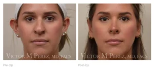 Dr. Perez performs a total approach to otoplasty with a posterior inconspicuous scar. With his technique, Dr. Perez will remove a portion of the ear cartilage and will use sutures to modify and retain the new shape of the ear. He then uses an anterior approach to weaken the forces on the anterior portion of the cartilage. This thus limits the probability of recurrence of the deformity.